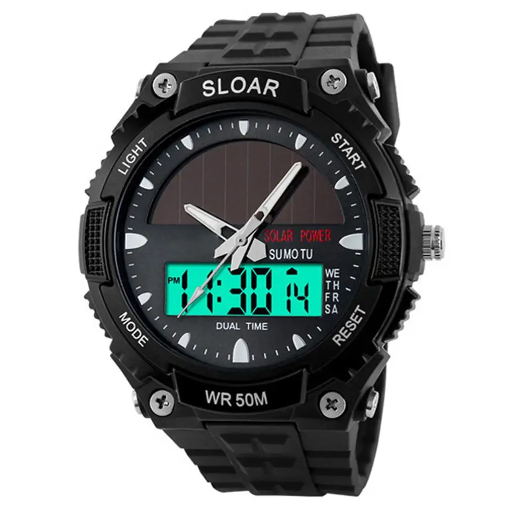 استعارات من 2018 جديد الرجال الرياضة الشمسية الطاقة التوقيت المزدوج عرض المياه مقاومة الإلكترونية ساعة معصم الرياضة ساعة رقمية montre أوم